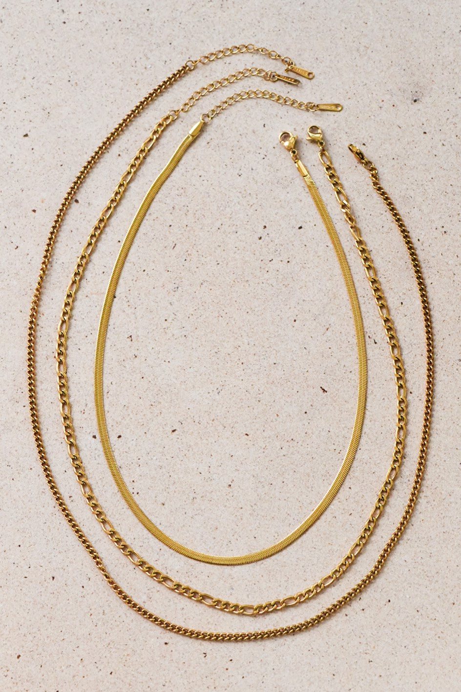 Dainty 18K Gold Plated Stainless Steel Chain Layering Necklace Set. Set of 3 layering necklaces including a herringbone chain necklace (15.5"L + extender), a Figaro chain (18"L + extender) and a small curb chain necklace (20"L + extender)