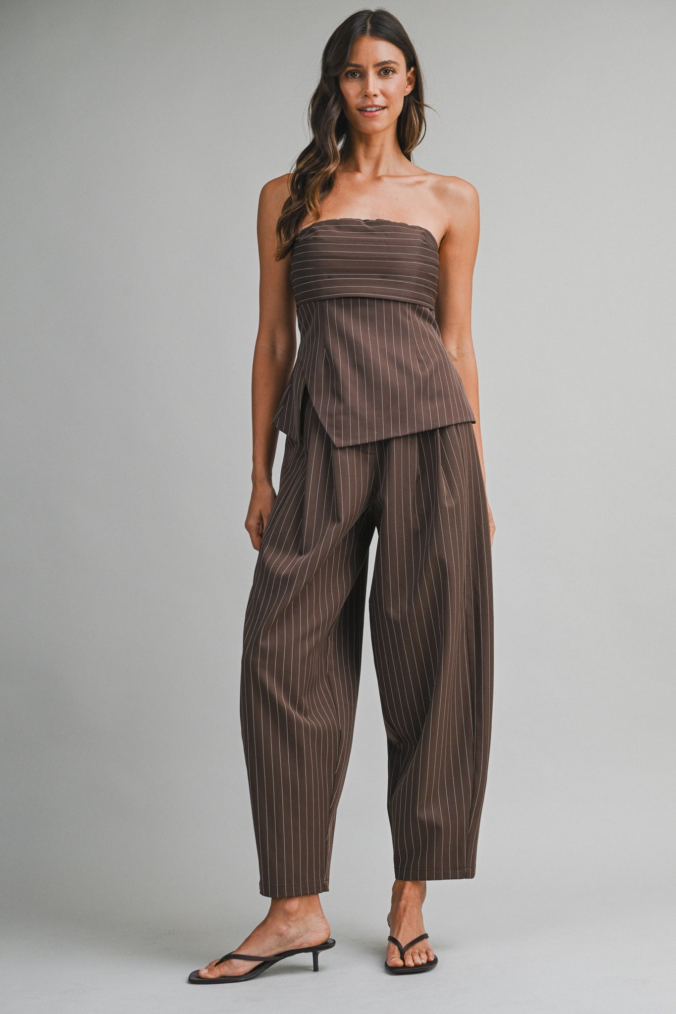 Pinstripe two-piece set featuring a strapless tube top with asymmetric hem and back exposed zipper closure, paired with relaxed cropped barrel-leg trousers. Lining.
