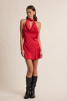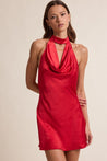 Red Holiday Satin Mock Cowl Neck Open Back Mini Dress