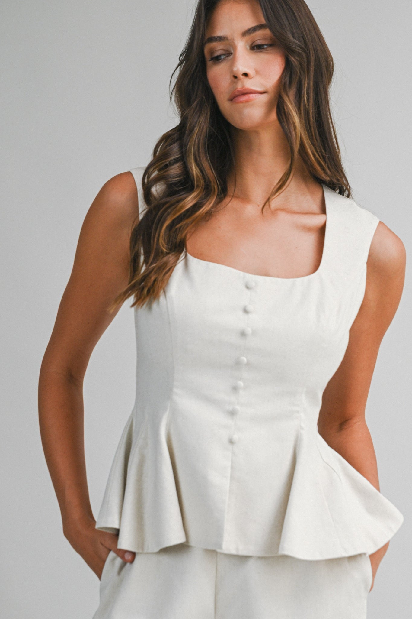 This two-piece set combines tailored sophistication with contemporary silhouette. The structured square neckline frames the shoulders while the peplum top adds dimensional volume at the waist, creating a flattering, fashion-forward profile. Paired with sleek matching pants, the ensemble delivers polished versatility—equally at home in professional settings or elevated casual occasions. Premium construction ensures the pieces move together seamlessly, offering a coordinated look that simplifies styling without sacrificing impact.